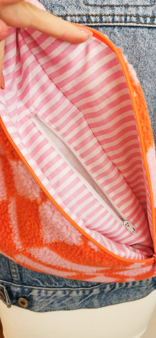 Große XL Umhängetasche Teddy Plüsch Bauchtasche Schachbrett Rosa/Orange