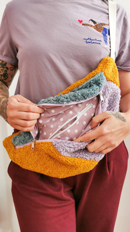 Bunte Colorblocking Bauchtasche Teddy Plüsch Flieder Mint