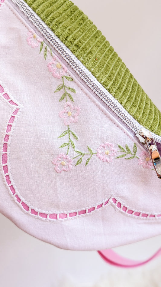 Upcycling Cord Bauchtasche Granny Hipbag Blumen Stickerei Rosa/Grün