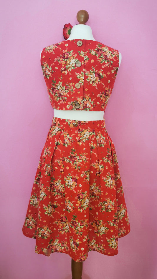 50s Swing Dirndl Kleid Rot/Grün Rosen mit Taschen - Unikat