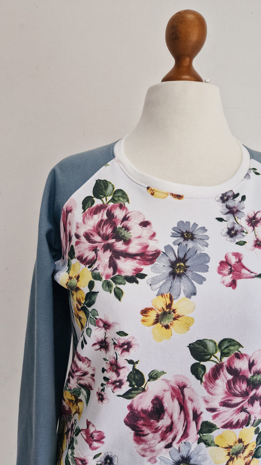 Blumen Sweatshirt Rockabilly Raglan Longsleeve Weiß/Blau