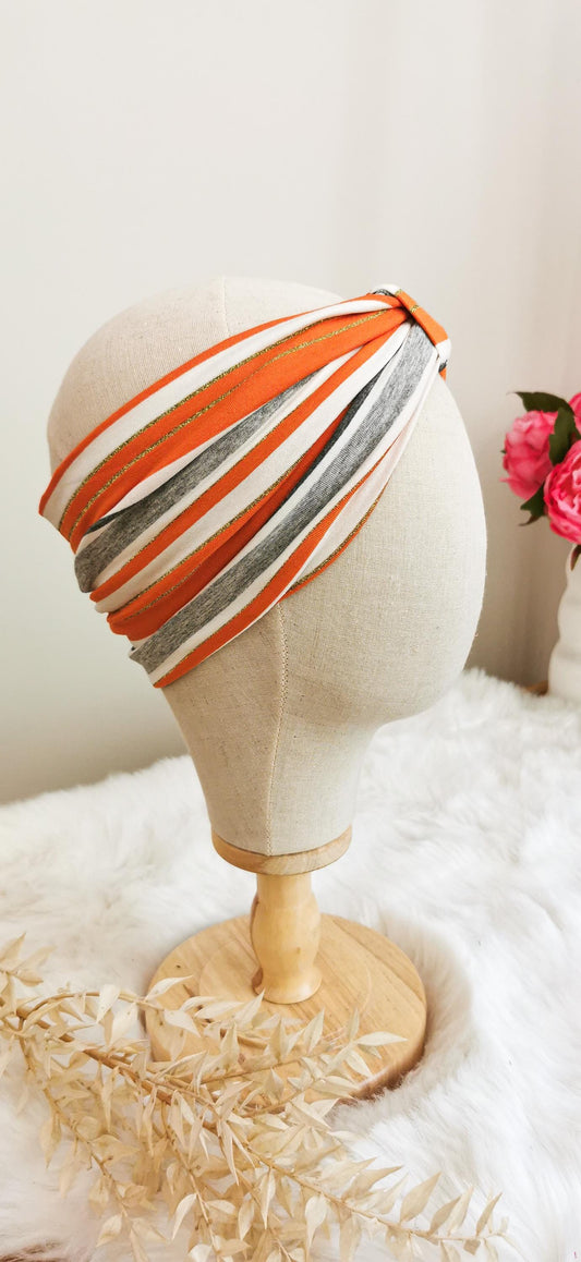 Weiches Turban Stirnband Orange/Grau Lurex Streifen