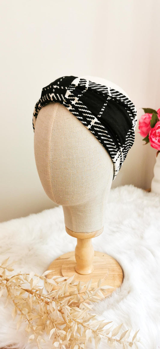 Weiches Retro Turban Stirnband Weiß/Schwarz kariert