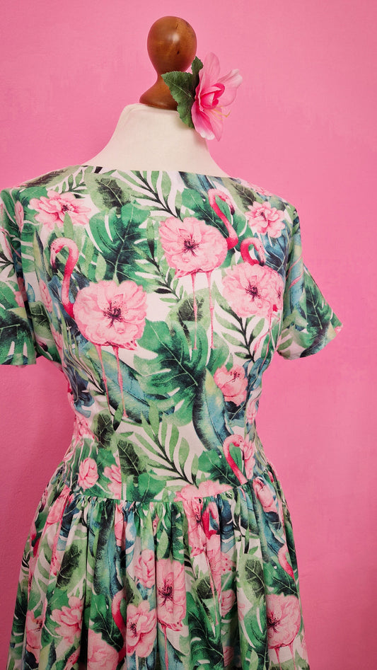 Tropisches 50s Kleid mit Taschen und Ärmeln Flamingos Blumen