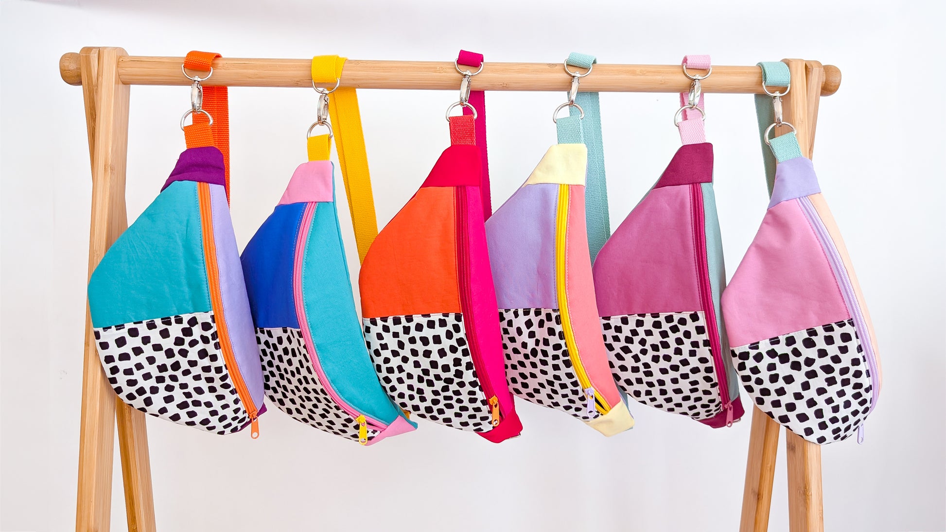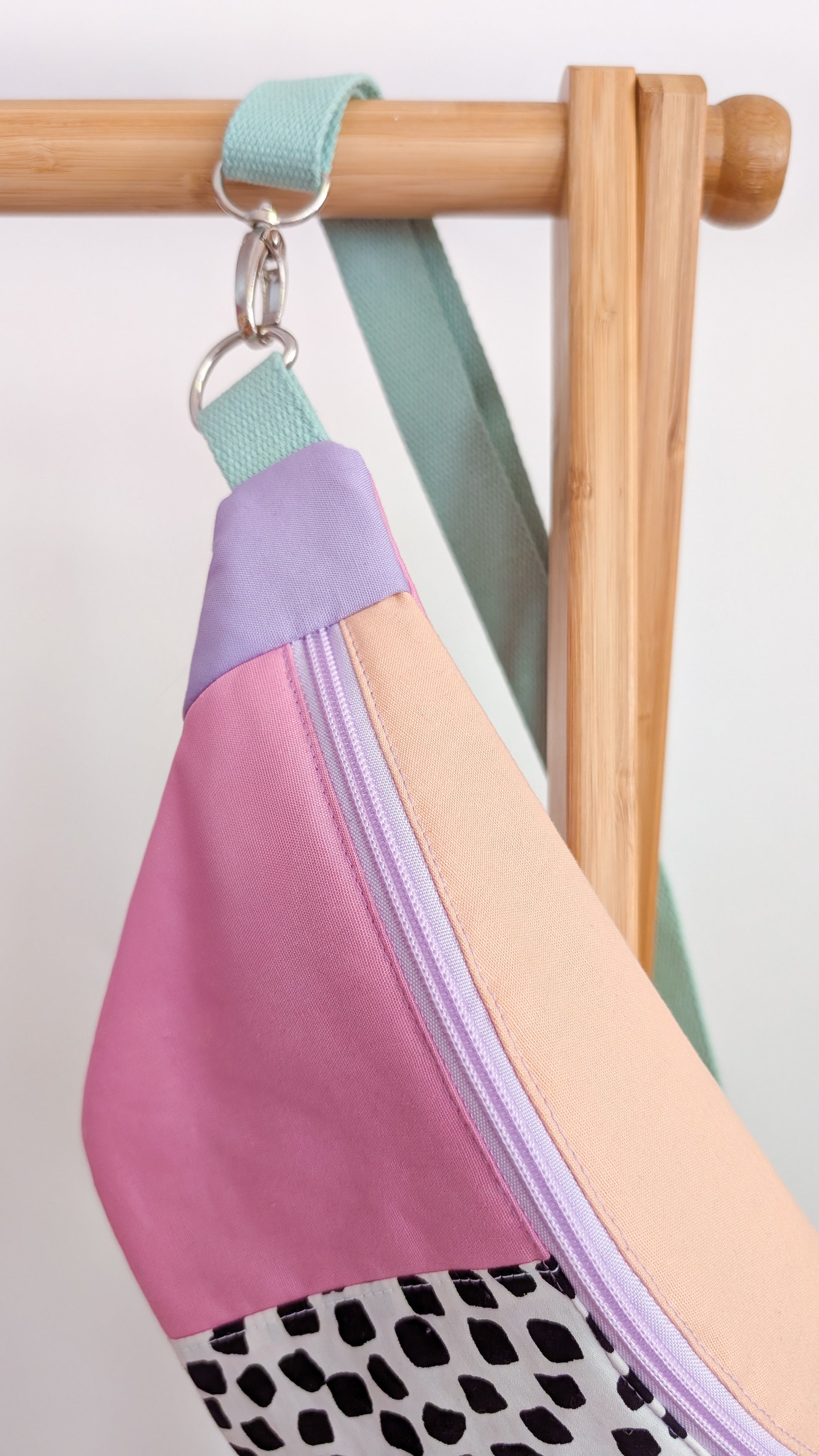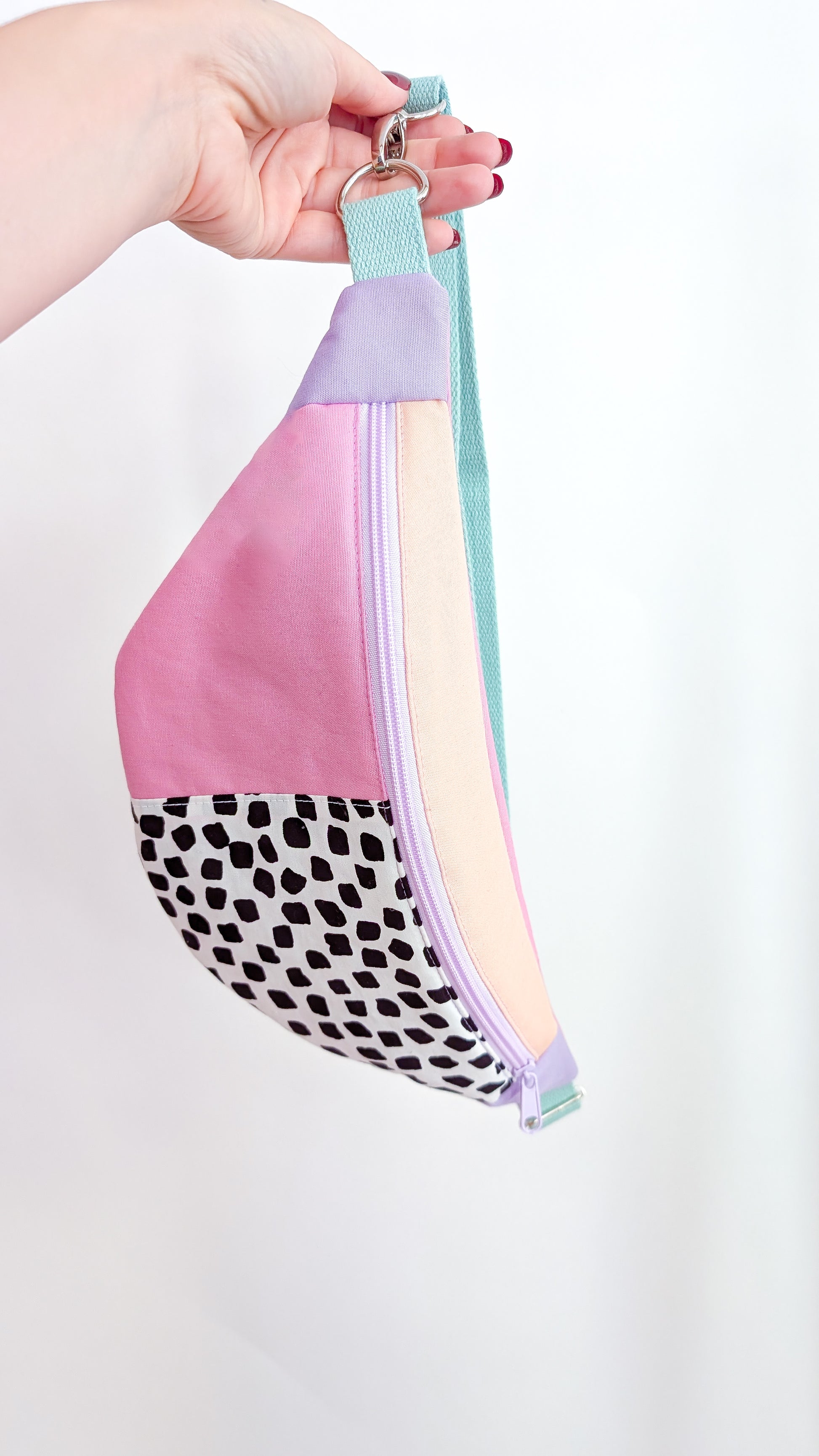 Bringe Farbe und Retro-Vibes in deinen Alltag mit dieser handgefertigten Bauchtasche im angesagten 80s Patch Design! In zarten Pastelltönen – Rosa, Peach und Flieder – kombiniert mit einem kontrastreichen, schwarz-weißen Tupfen wird diese Hip Bag zum absoluten Hingucker.