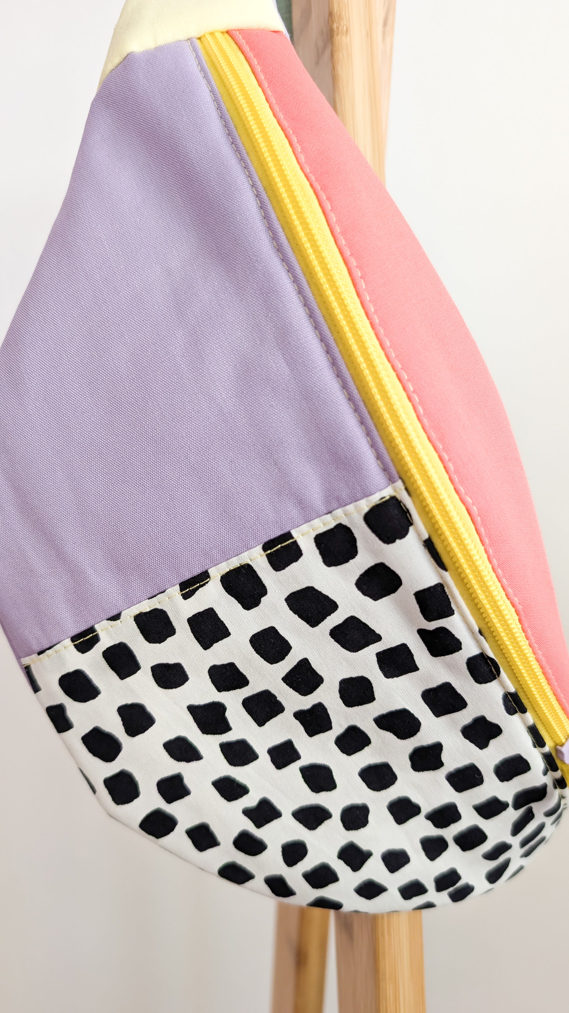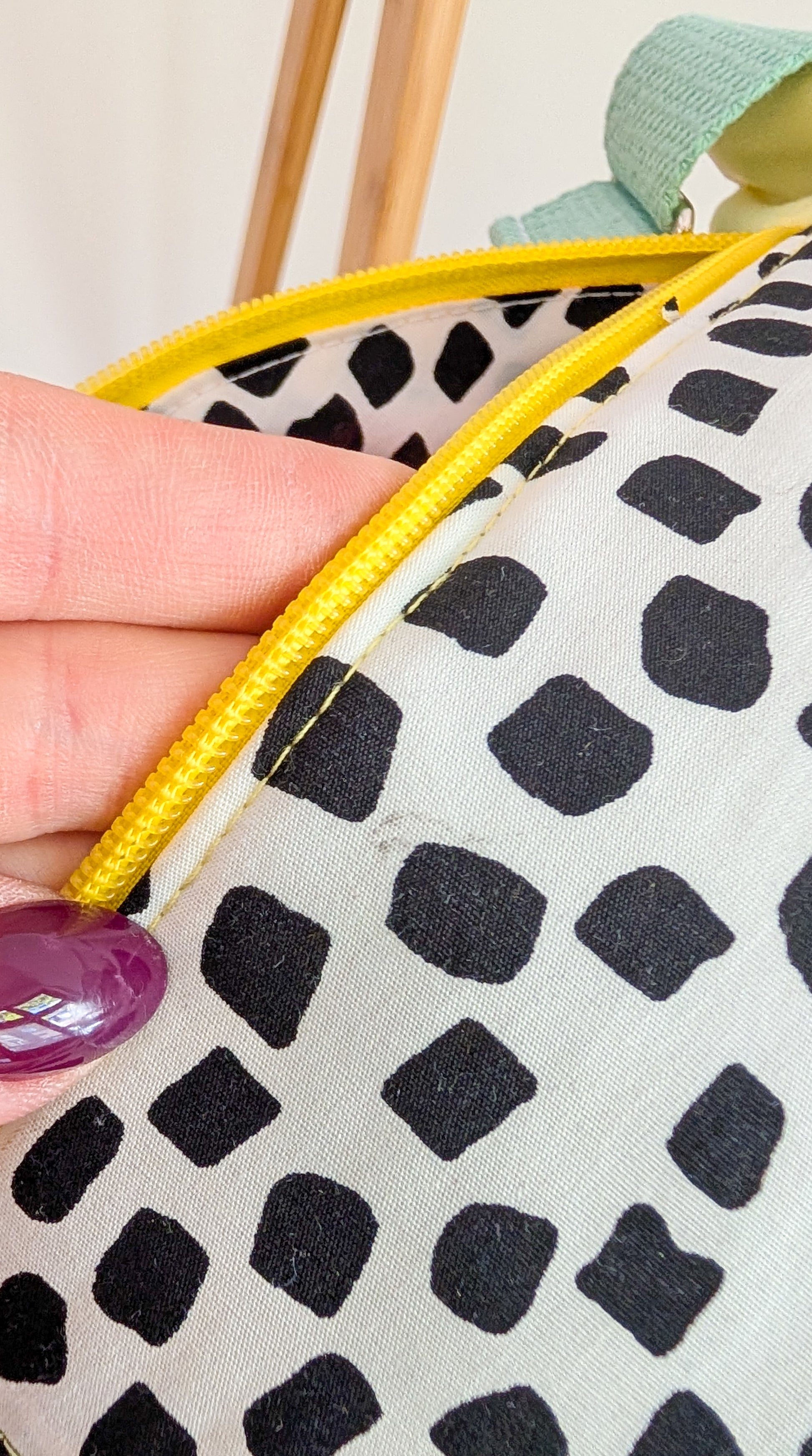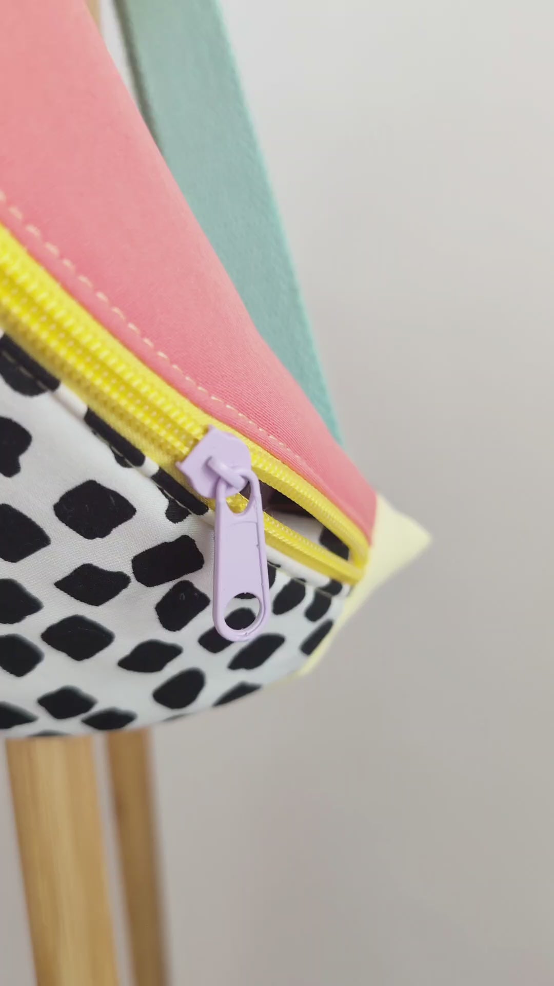 Stylische Hipbag Bauchtasche / Cross Body Bag aus einem tollen Baumwollstoff mit Tupfen Print. Dazu passend sind sämtliche Teile in pastell Farben gehalten, selbst das Futter ist wild gemixt. Das Highlight sind die Farbakzente, denn der Gelbe Reißverschluss, sowie das mintfarbene Gurtband stechen hier total raus!