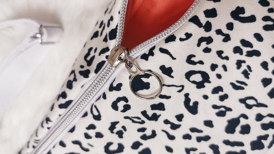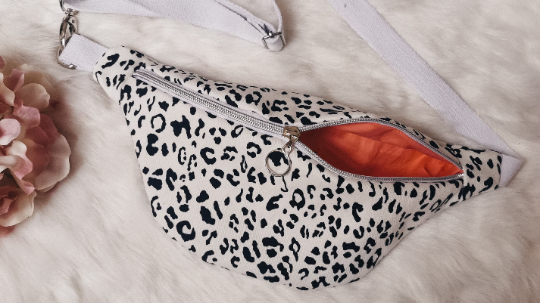 Stylische Hipbag Bauchtasche / Cross Body Bag einem Canvas mit Leopardenmuster in schwarz/weiß. Das Futter innen ist aus einem knalligem Baumwollstoff in Koralle.