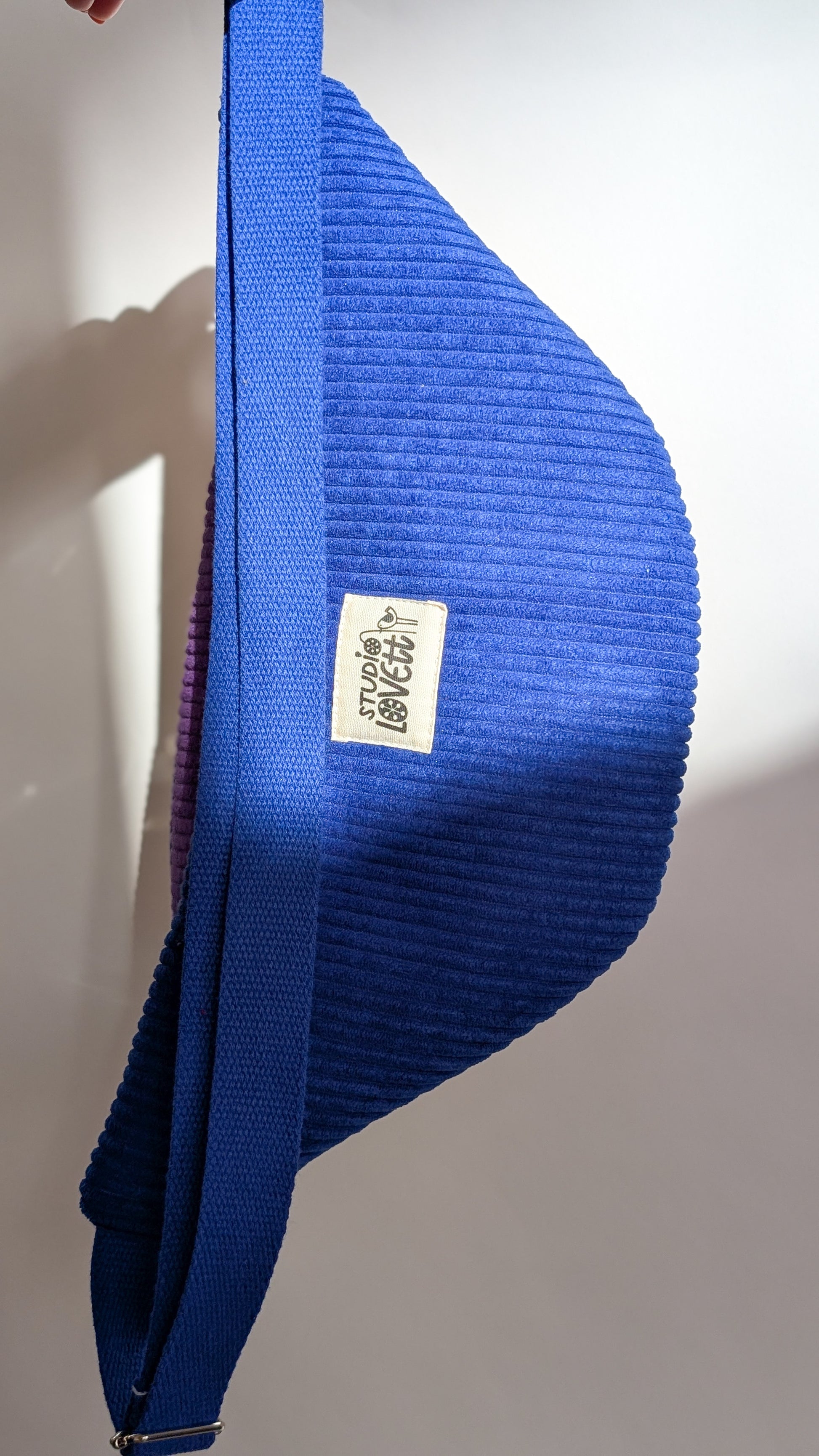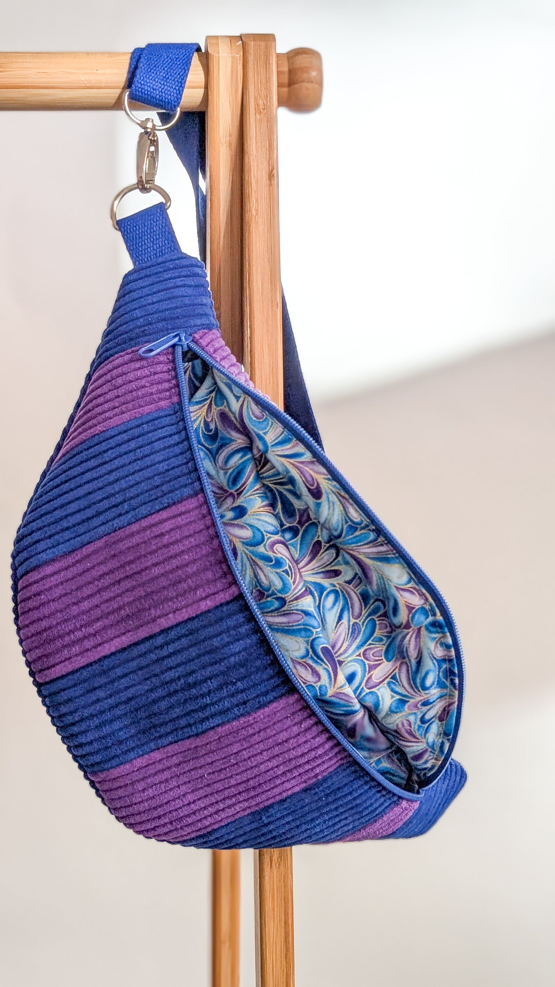 Du liebst es farbenfroh, praktisch und einzigartig? Dann ist diese bunte Bauchtasche genau das Richtige für dich! Diese Tasche kombiniert lila und blaue Cordstreifen mit silbernen Metallteilen - ein absoluter Hingucker!