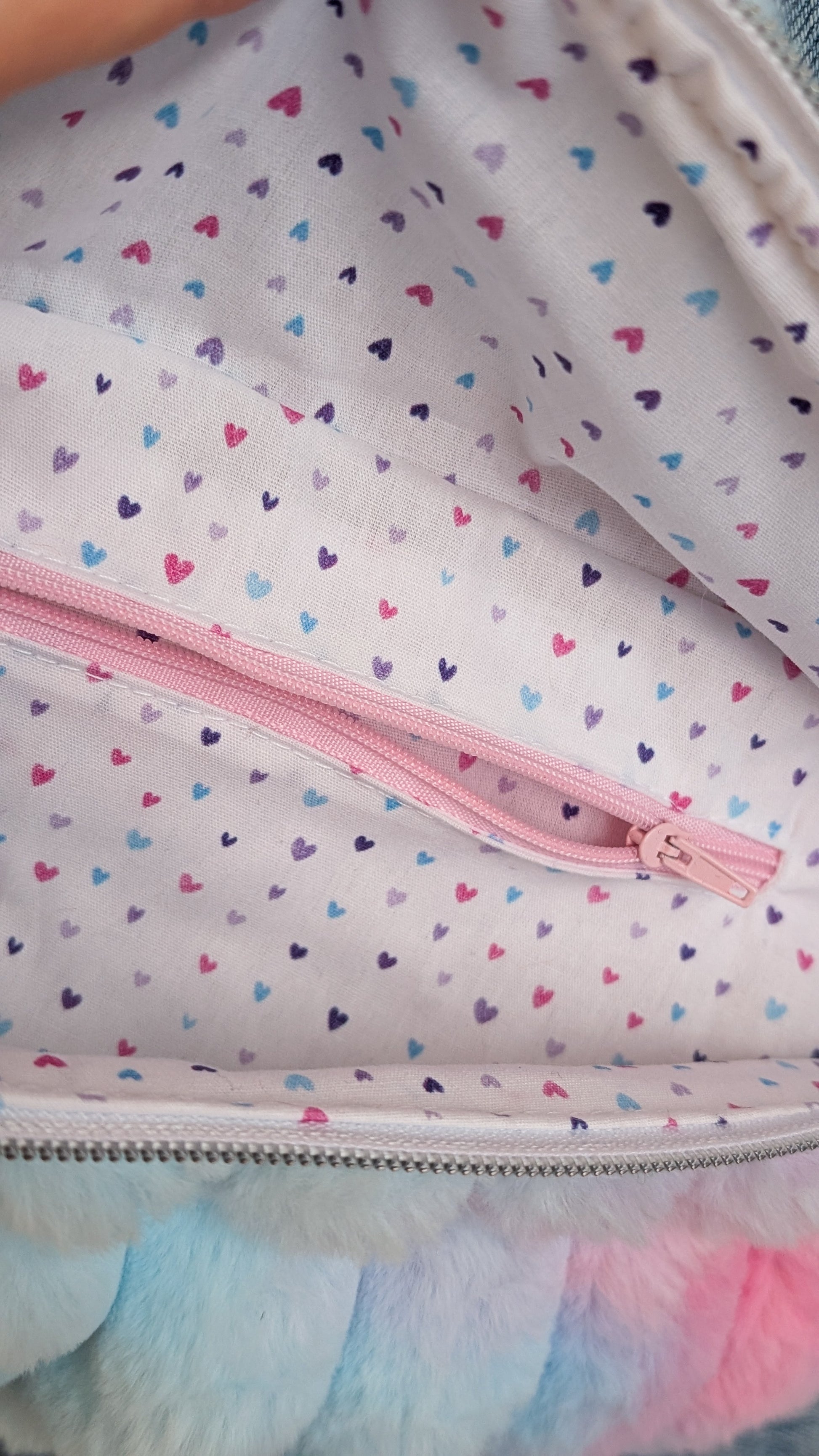Der silberne Reißverschluss bringt einen edlen Touch und rundet das Design perfekt ab. Im Inneren erwartet dich ein süßes Herzchenmuster in Pastellfarben, das für extra gute Laune sorgt, sowie ein zusätzliches Fach für noch mehr Ordnung.