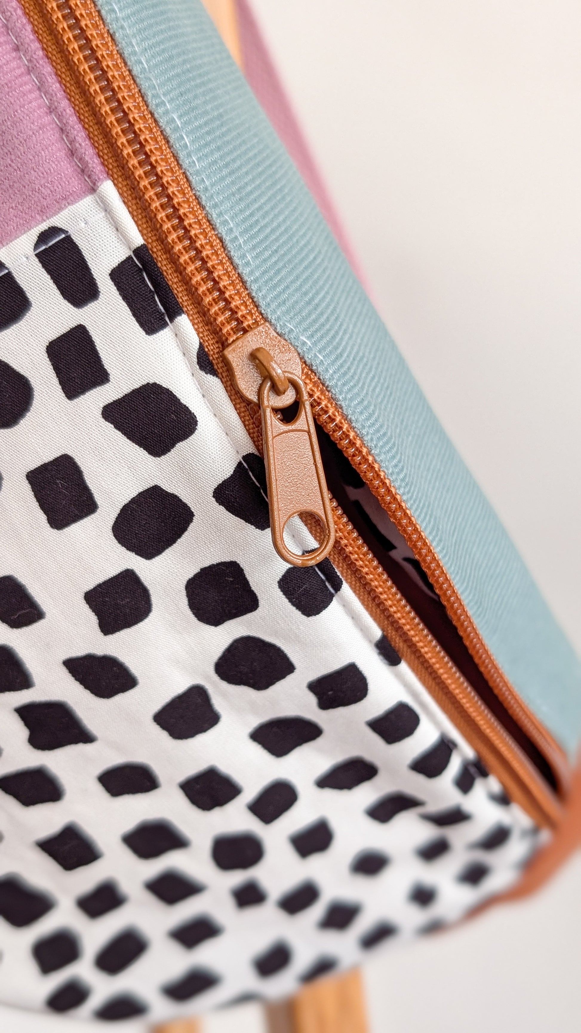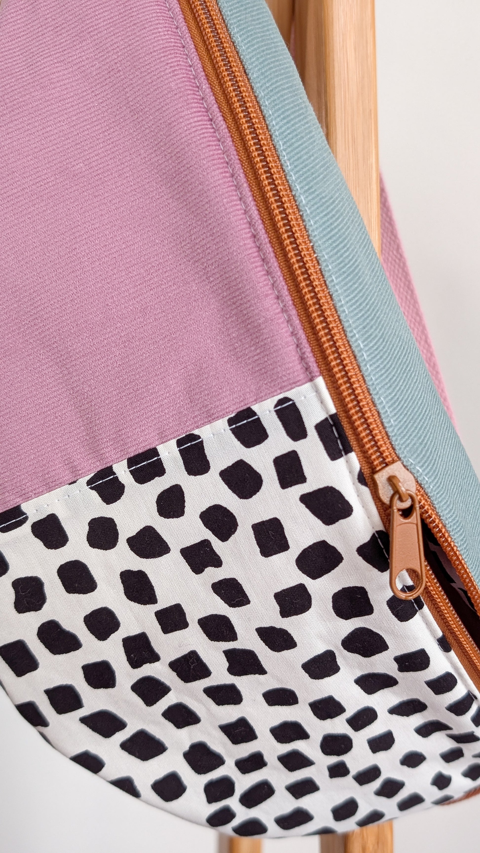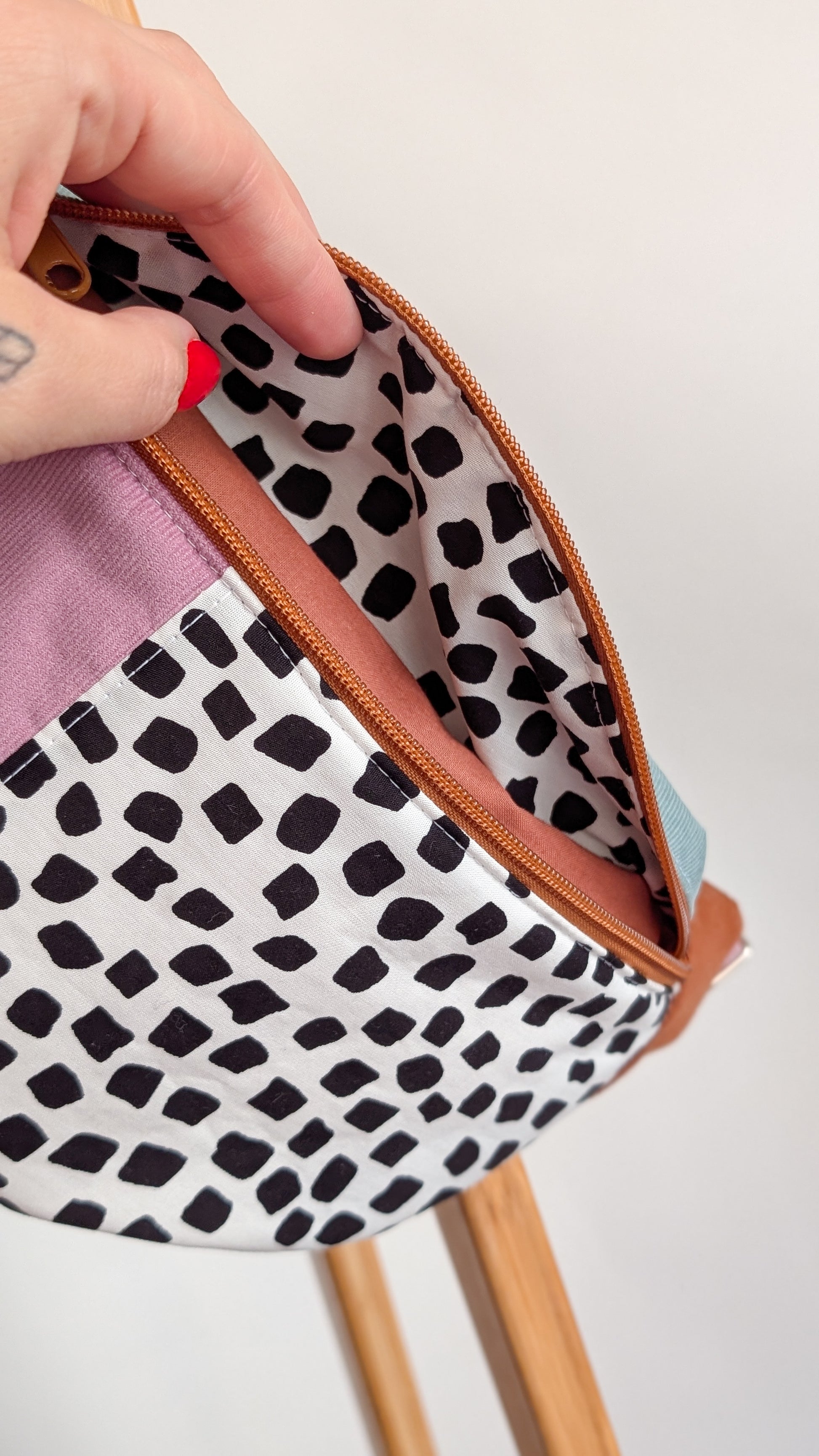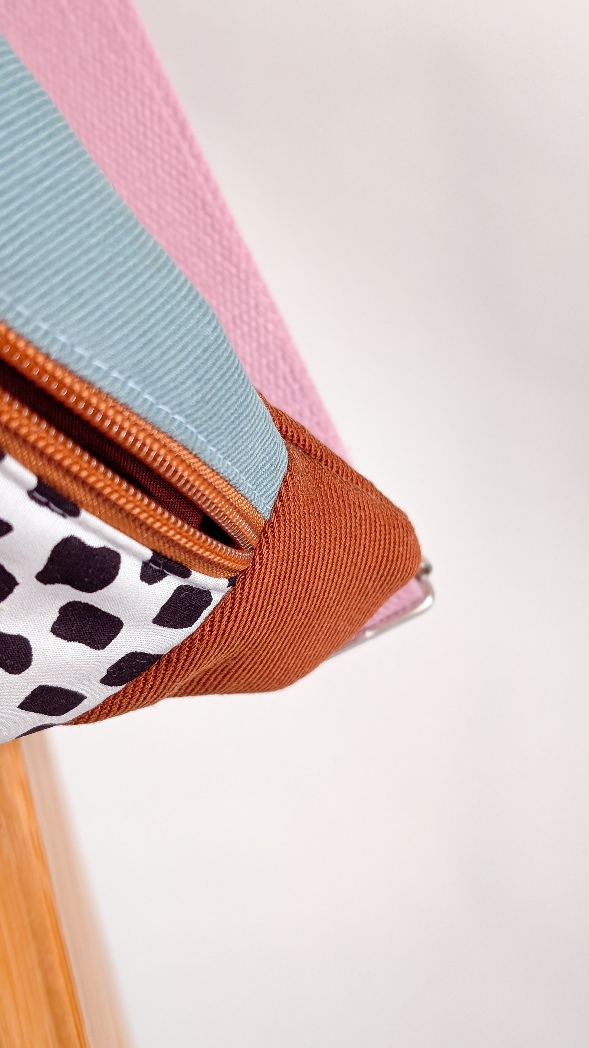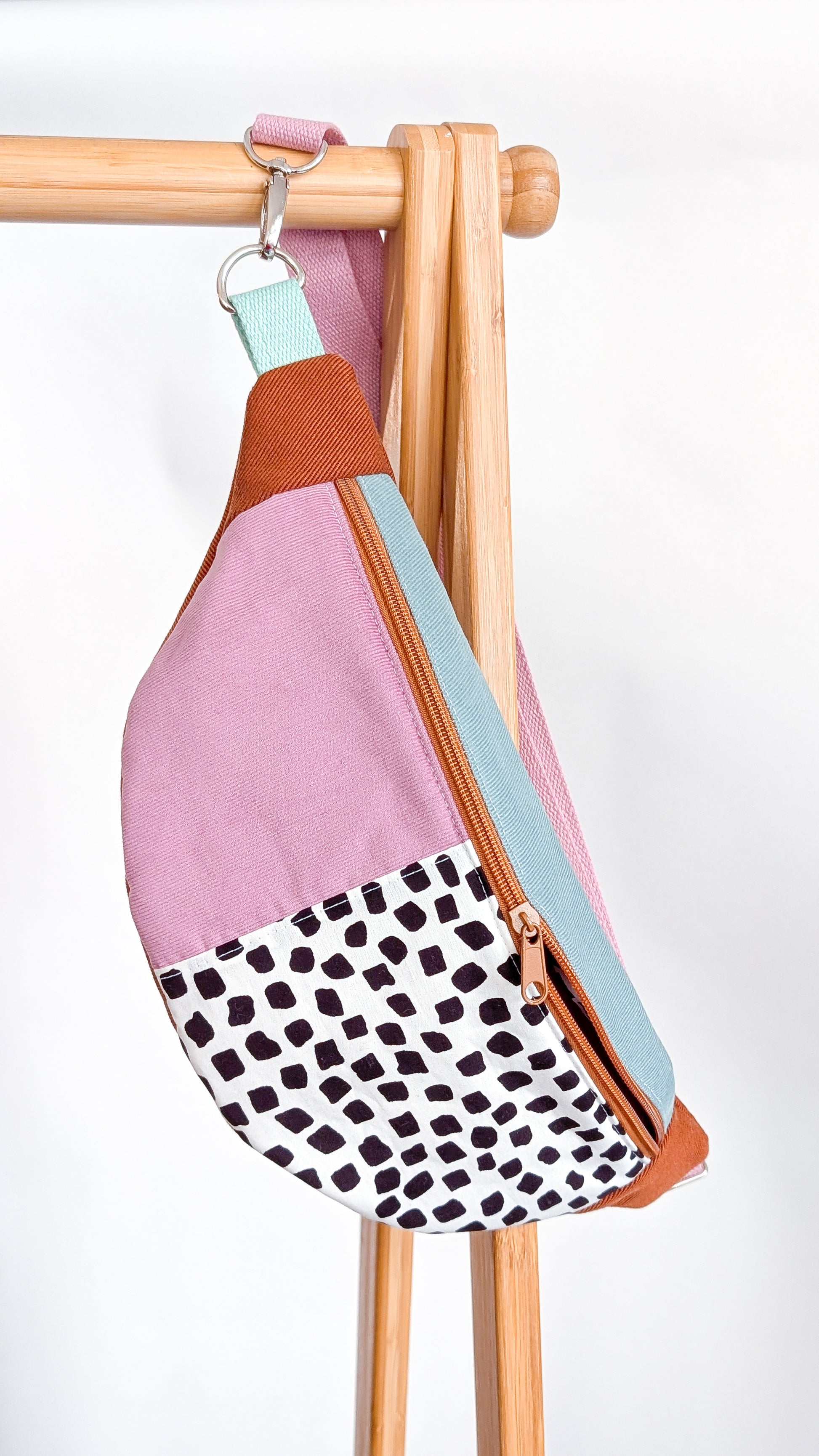 Bringe Farbe und Retro-Vibes in deinen Alltag mit dieser handgefertigten Bauchtasche im angesagten 80s Patch Design! In herbstlichen Pastelltönen – Mint, Dusty Lavender und ein schönes braun– kombiniert mit einem kontrastreichen, schwarz-weißen Tupfen wird diese Hip Bag zum absoluten Hingucker.