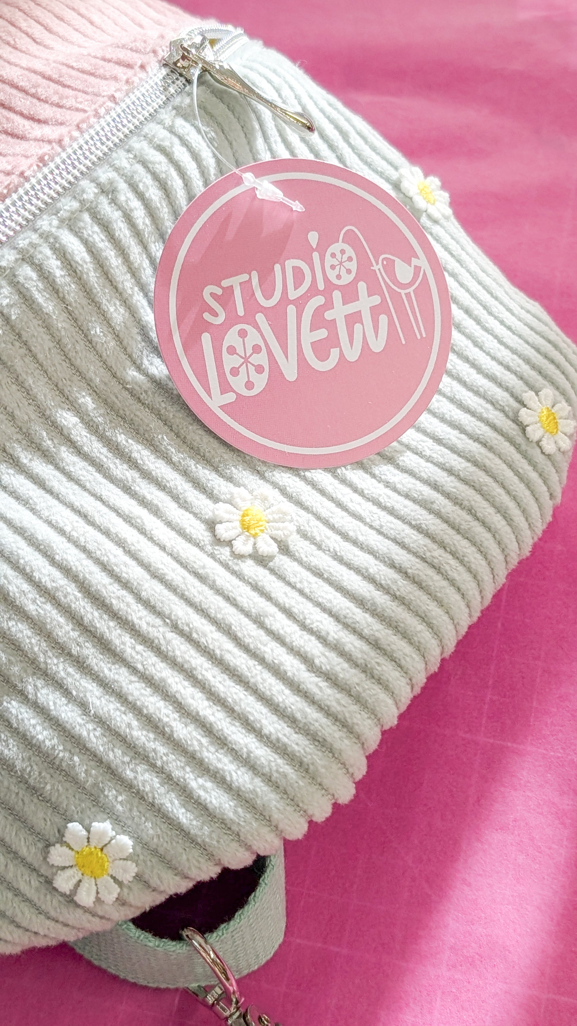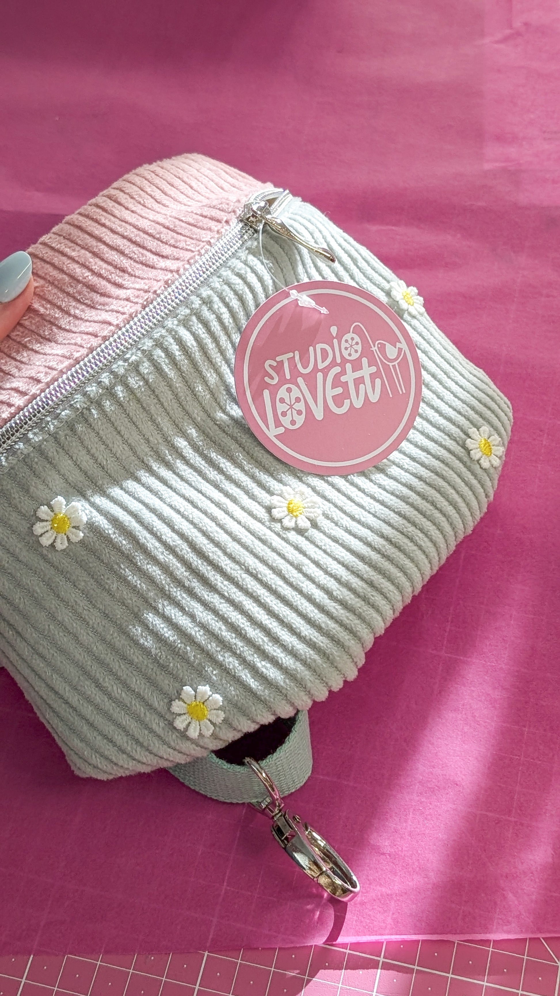 Gefertigt aus Cord in pastelligen Tönen in mint, rosa und gelb und mit von Hand applizierten Gänseblümchen (Daisies) ist sie ja schon sehr besonders. ABER du kannst auch noch den Zipper wählen! Möchtest du den schlichten "Tropfen" oder die verspielte "Daisy"?