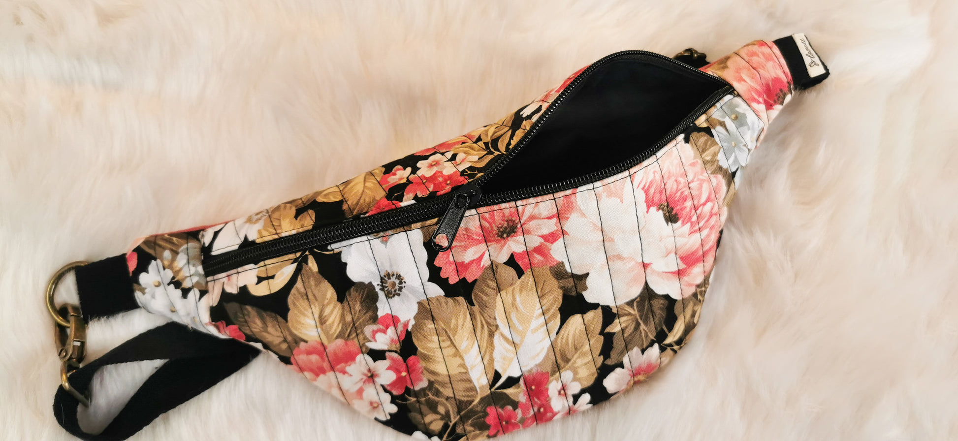 Romantische Hipbag Bauchtasche / Cross Body Bag aus einem schönen Baumwollstoff mit romantischem BLUMEN Print. Komplett gequiltet. Das Rückenteil ist aus einem farblich passenden Canvas in Rosé, das Futter innen ist aus schwarzem Baumwollstoff. Zipper & die Metallteile sind bronzefarben gehalten.